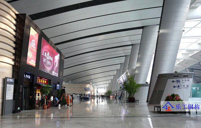 地上部分长轴500米,短轴350米;地下部分长轴397.1米,短轴332.60米。地上沿长轴方向两翼部分为各三跨钢结构通透雨篷,中间站房为椭圆形高大建筑,地上两层,地下三层。在站房屋顶中间轴线处设置天窗以获得自然采光。雨棚上方也大规模设置天窗,在地下层的墙面采用了一面红墙,对面是商业设施的白色墙面,突出对比效果。